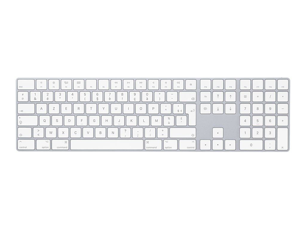 Le Magic Keyboard avec pavé numérique est un clavier étendu qui offre des commandes de navigation pour un défilement rapide et des touches fléchées de taille standard pour les jeux.